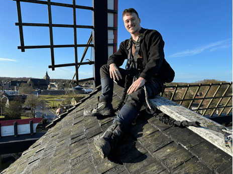 Kris is een jongeman die uit Gendt komt, hij vindt werken aan – en onderhoud van monumenten erg leuk en studeert bouwkunde met als specialisatie monumentenbeheer en restauratie. Kris is al in opleiding voor windmolenaar. U ziet Kris hier op de nok van een standerd molen