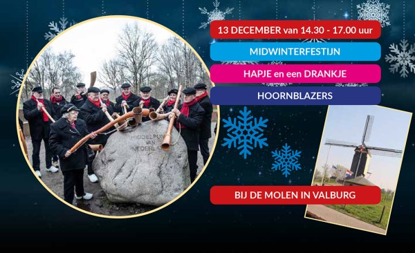 Midwinterfestijn bij de Molen in Valburg. Gezellige middag met muziek van de Hoornblazers, hapjes en drankjes, U bent van harte welkom vanaf 14.30 uur.
